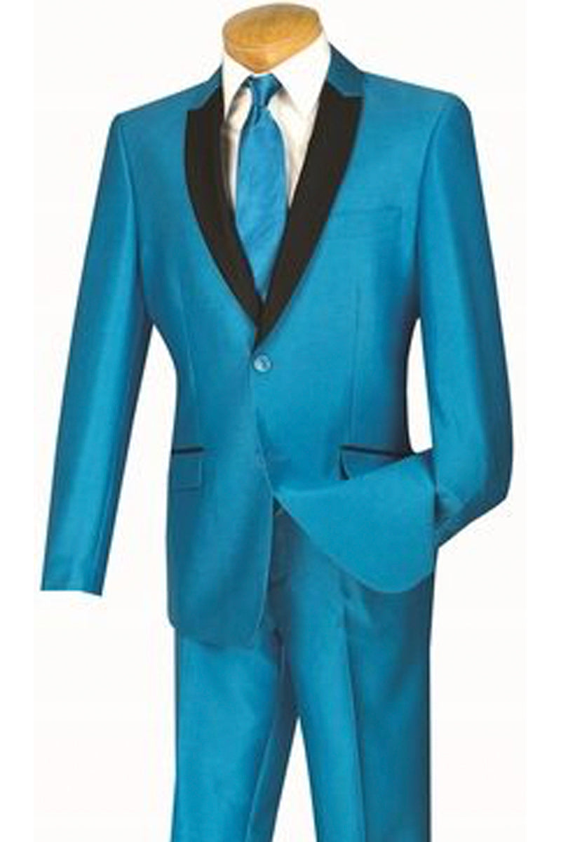 Mens 2 Buttton Slim Contrast Peak Lapel Tuxedo in Turquoise